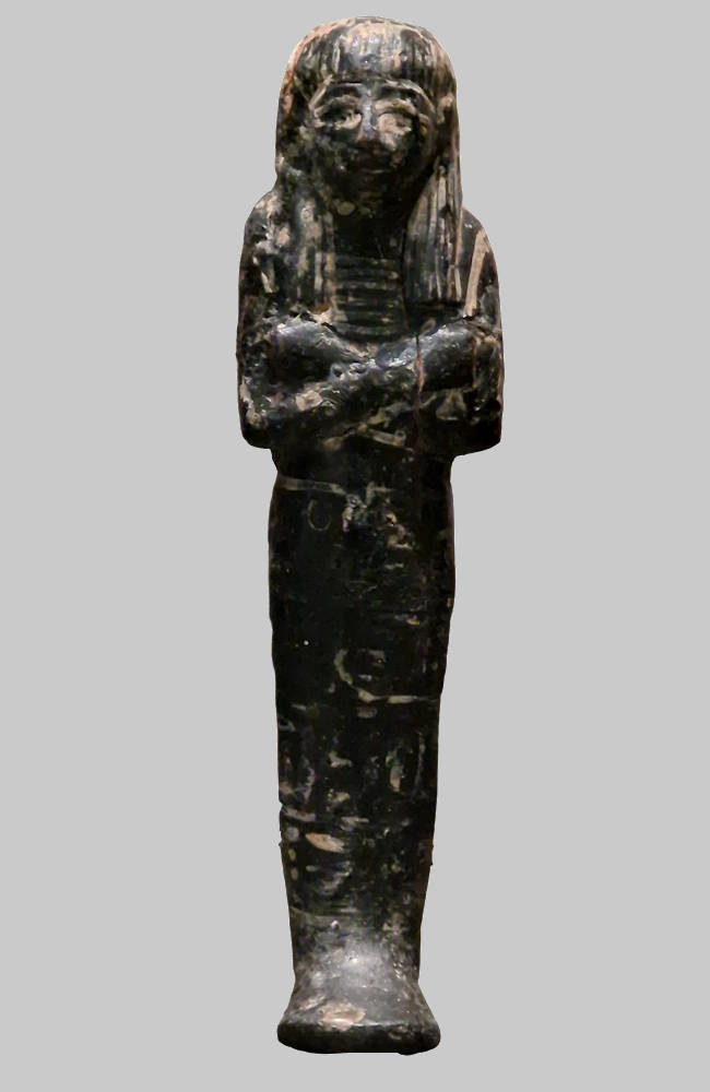 This wooden shawabty (17 cm) is coated completely with bitumen. It depicts a mummiform figure wearing a tripartite wig. Its arms are crossed opposite right over left on the chest. Very faded remnants of yellowish-white paint are still evident for detailing of attributes such as hair tresses in the wig and facial features. The hands hold implements of field work now mostly indistinct but likely a hoe held against each shoulder. Three horizontal bands of hieroglyphic text with dividing lines also appear on the legs, painted in yellow that has largely faded. The text includes the cartouche of Queen Nefertari, wife of King Ramesses II of Dynasty 19. The front of the foot has broken away.