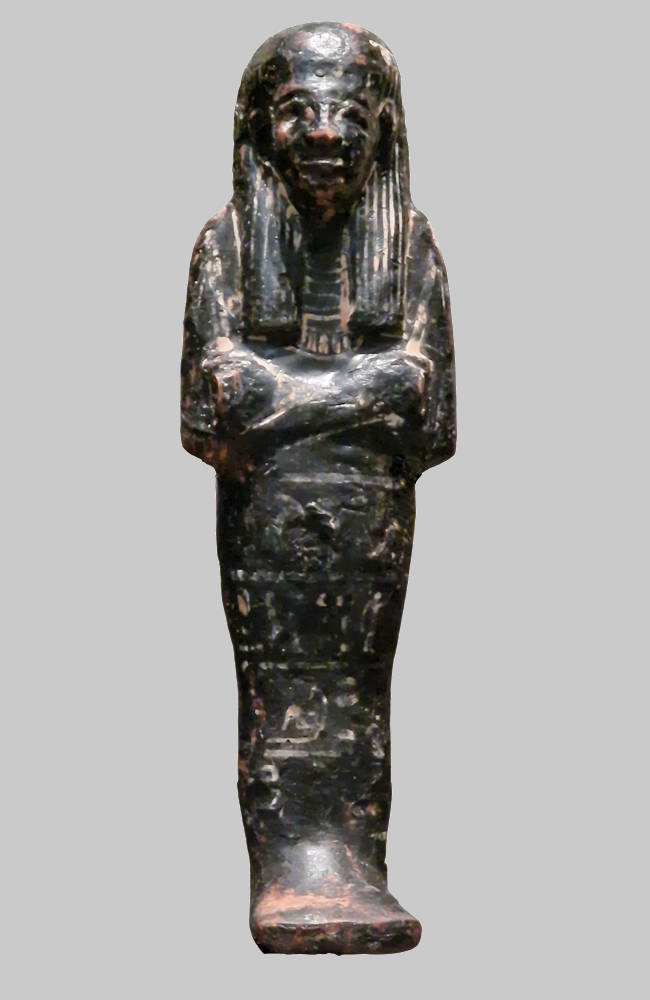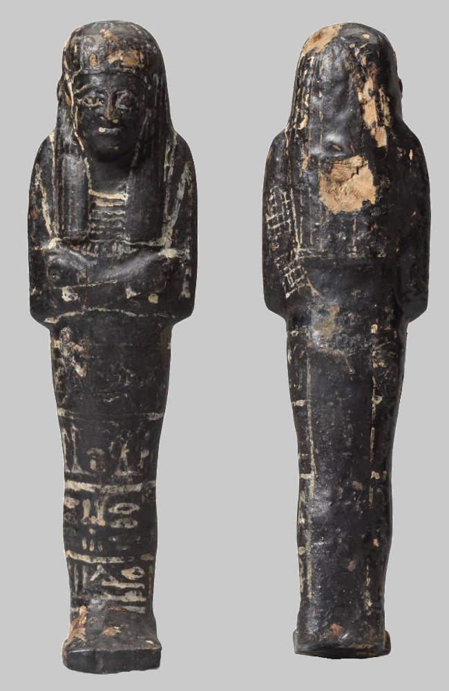 This wooden shawabty (20 cm) is coated completely with bitumen. It depicts a mummiform figure wearing a tripartite wig. Arms are crossed opposite right over left on the chest. Very faded remains of yellowish-white paint are still evident for detailing of attributes such as hair tresses in the wig and facial features. The hands hold implements of field work, one hoe held against each shoulder. Four horizontal bands of hieroglyphic text with dividing lines also appear on the legs, painted in yellow that has largely faded. Cartouches of Queen Nefertari (wife of King Ramesses II of Dynasty 19) are discernible in the remaining text. A chip is missing from the back.