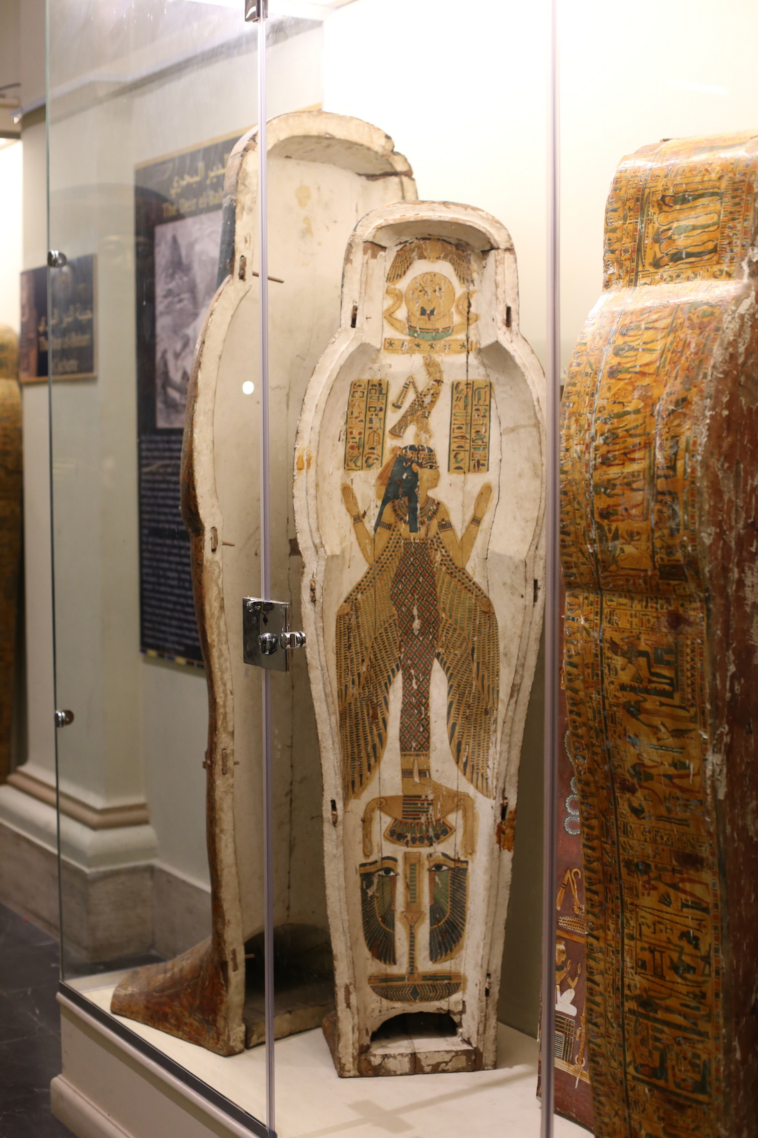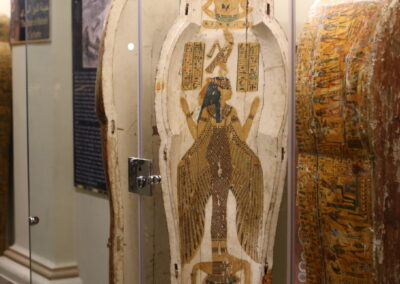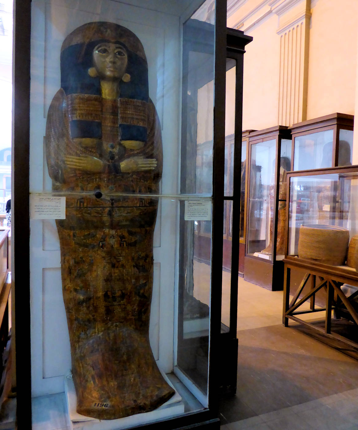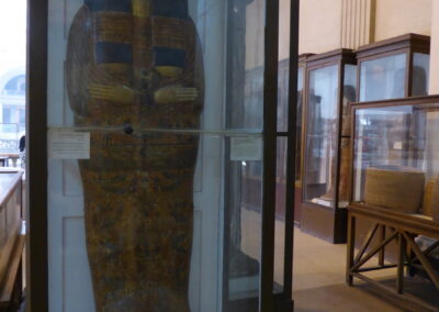 The condition of the coffins supports the notion of a complex post-burial history. Nesykhonsu’s mummy (CG 61095) was discovered in just one of the two coffins, presumably the inner one, though the original records from the discovery and clearance of DB 320, made in the late 19th century, are ambiguous and inconsistent. The lid of this inner coffin and the accompanying mummy board had both been damaged, with the gilded faces and hands removed, while the outer coffin survived largely intact. At some stage, the mummy of Ramesses IX was also found within one of these two coffins, but due to the chaotic nature of the 1881 clearance, modern researchers cannot definitively state which individual was placed in which coffin.