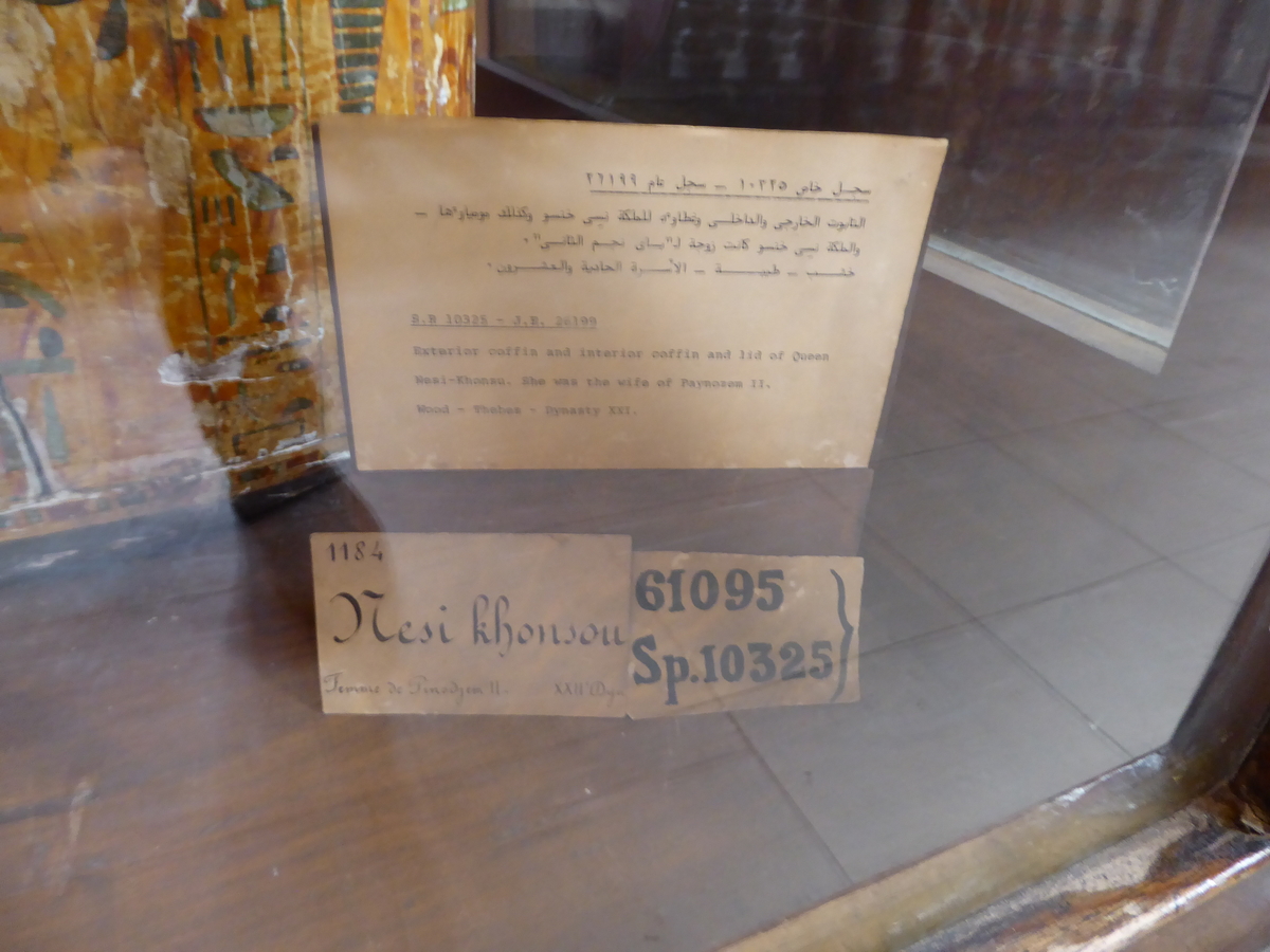 Close inspection of the inscriptions on Nesykhonsu A’s two coffins (CG 61030, mummy CG 61095) and mummy board has revealed that these items originally belonged to a woman named Isetemkheb. Kenneth Kitchen tentatively identified this individual as Isetemkheb C, the wife of Menkheperra (TIP, 474f.). However, Andrzej Niwiński argues that the original owner was in fact Isetemkheb D, Pinedjem II’s first wife, whose mummy was also discovered in DB 320. According to Niwiński, after Pinedjem II transferred his affections to the younger Nesykhonsu A, and she died unexpectedly before her own funerary equipment could be prepared, he repurposed Isetemkheb D’s coffins for Nesykhonsu’s burial. As a result, Isetemkheb D required a new set of coffins for her own interment, which were ultimately those in which she was found in DB 320 (JEA 74 [1988], 226ff.).