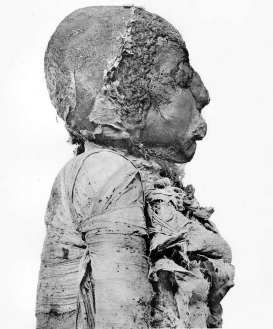 Tayuheret’s ears were covered with hair, which Smith believed consisted mostly of a wig. Her own hair was almost completely white, indicating she had died at an advanced age. Smith also noted that insects had damaged the skin of her face, particularly the forehead. This may suggest that an unusually long period separated Tayuheret’s death from her embalming. On the other hand, the bandages themselves also appear pitted with small holes (see photo below), possibly caused by insect activity post-embalming. Smith remarked that the plate used to close the embalming incision differed from the engraved examples usually employed during the 21st Dynasty, being plain and fusiform in shape, akin to those used by embalmers in the 18th Dynasty.